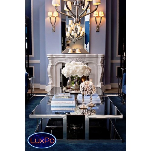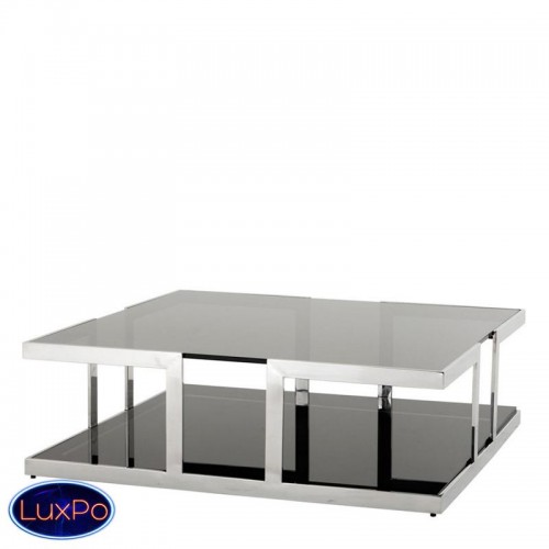 Журнальный столик Coffee Table Treasure на основании из нержавеющей стали. Столешница выполнена из плотного стекла дымчатого цвета, нижняя полка из стекла черного цвета.