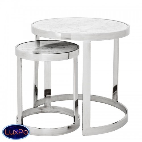 Набор из 2-х приставных столиков Side Table Fletcher set of 2 на основании из нержавеющей стали. Столешницы из мрамора белого цвета. Размеры: 56х56х56 см, 45.5х35х35 см.