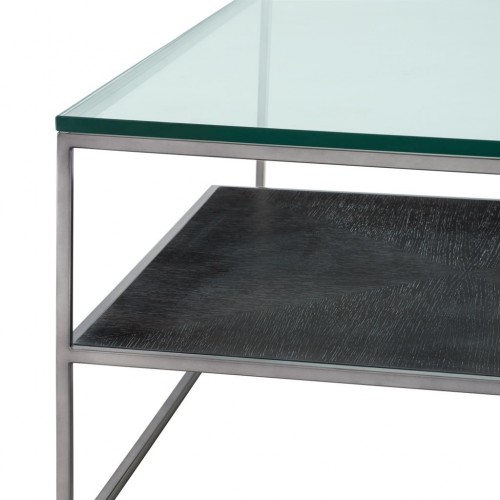 Журнальный столик Coffee Table Durand с каркасом из никелированного металла. Столешница выполнена из плотного прозрачного стекла. Внутри столика мини-столик с деревянной столешницей.