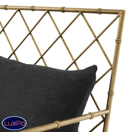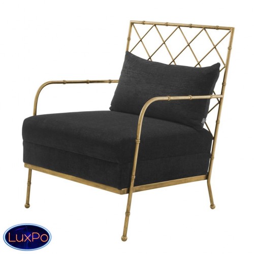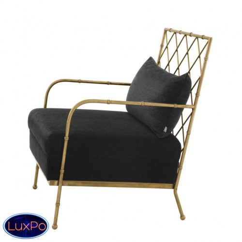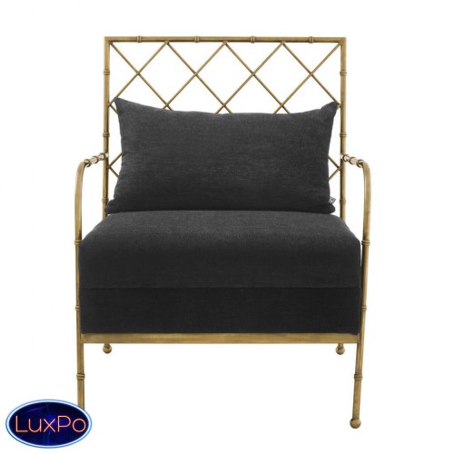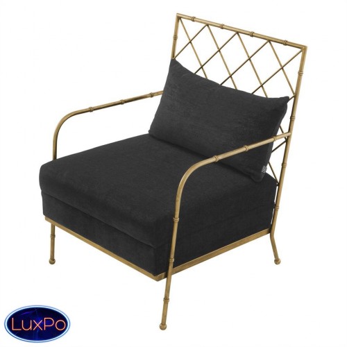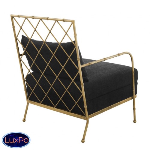 Кресло Chair Bahamas с каркасом из металла цвета состаренная латунь. Обтянуто тканью черного цвета. В комплекте подушка под спину. Состав ткани: 64% полиэстер, 36% вискоза.