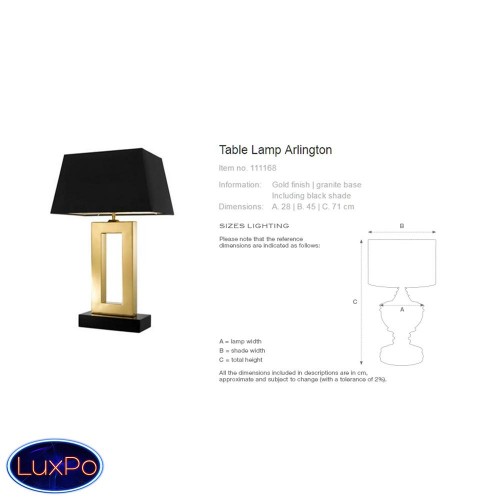Настольная лампа Table Lamp Arlington на основании золотого цвета и базе из черного гранита. Текстильный абажур черного цвета скрывает лампу.