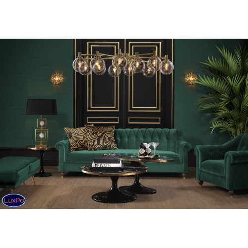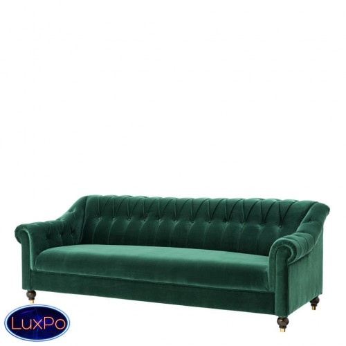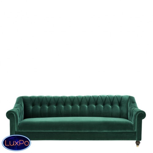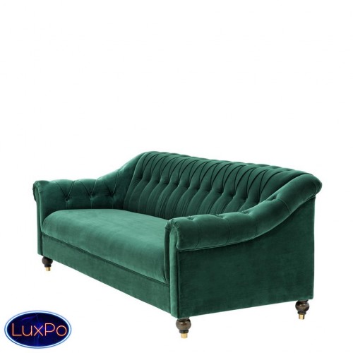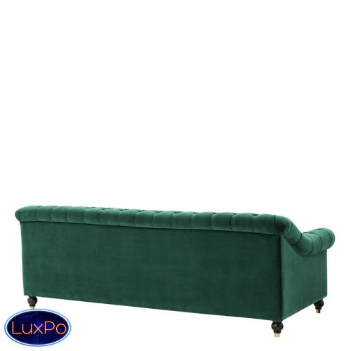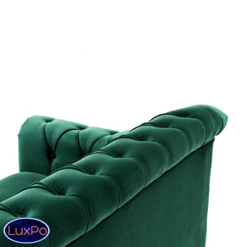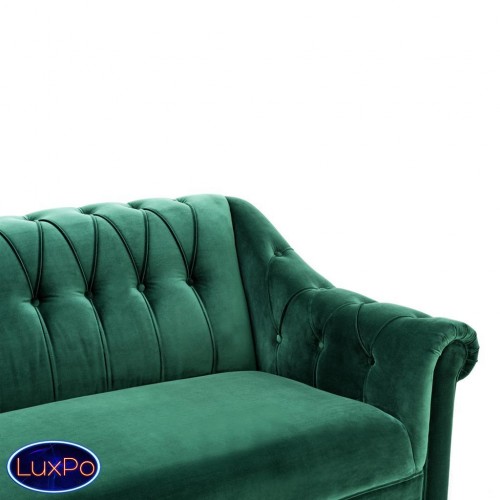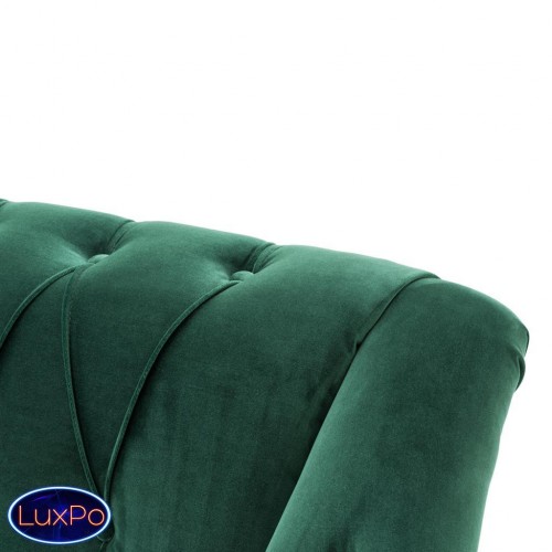 Диван Sofa Brian из ткани зеленого цвета, спинка и подлокотники выполнены в технике Капитоне. Состав ткани: 95% полиэстер, 5% хлопок. Ножки из дерева коричневого цвета с золотыми металлическими набойками.