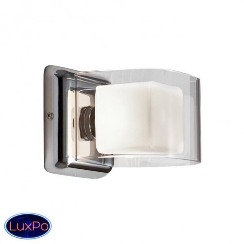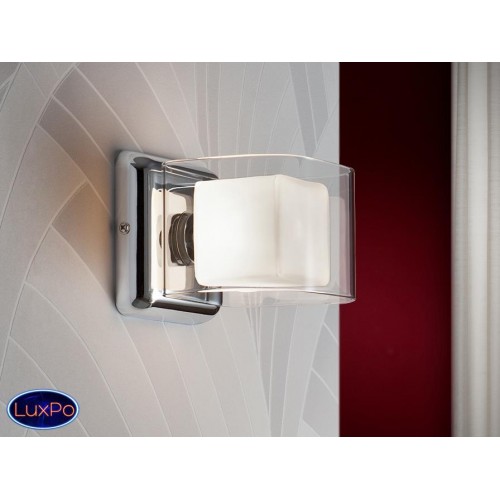 Настенный светильник Cube из хромированного металла с покрытием. Двойной плафон из штампованного стекла: внешний плафон из прозрачного стекла и внутренни1 из стекла опалового цвета.