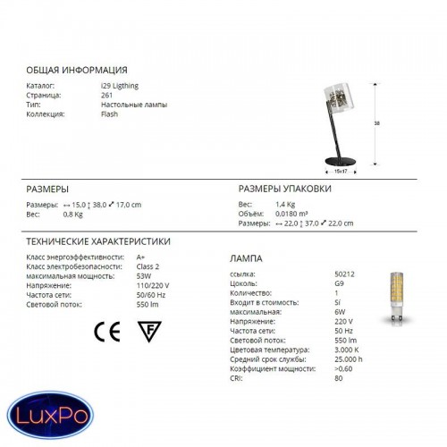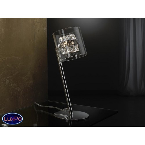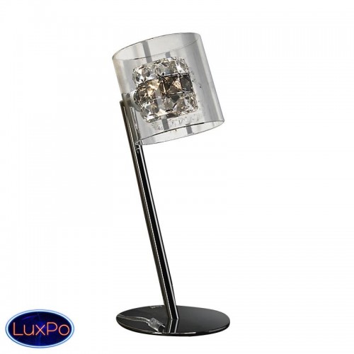Настольная лампа из коллекции Flash выполнена из металла с покрытием "блестящий хром". Двойной плафон: внешняя часть выполнена из прессованного стекла, внутренняя - из кристаллов из прозрачного и дымчатого гранёного стекла.