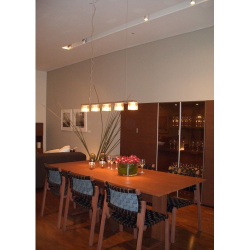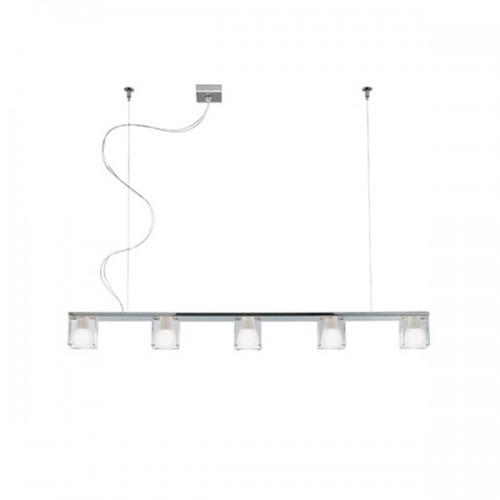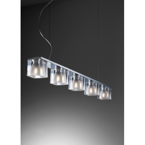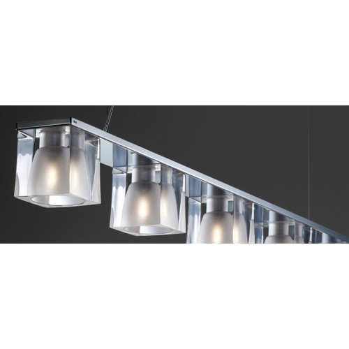 На плоском хромированном основании подвесного светильника коллекции CUBETTO располагается 5 плафонов , выполненных в виде куба. Свет, проникающий сквозь стеклянную основу плафонов удивительным образом подчёркивает красоту светильника и создаёт уютную атмосферу в помещении. Плафоны изготовлены из хрусталя (24% PbO) и имеют пескоструйную обработку внутренней поверхности. Правильность геометрических форм не нарушает общую гармонию и элегантность светильника. Система крепления хромированная. Высота светильника регулируется до 210 см. Арт. D28A0600