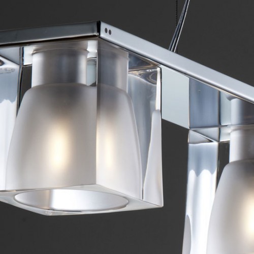 Cubetto. Квадратный рассеиватель из хрусталя розового цвета, внутренняя часть — пескоструйная обработка. Металлическое крепление из блестящего хрома. Регулируемая высота 20-210 см. Дизайн Pamio. Арт. D28A0900 Некомплект - нет декоративных шайб у потолочных креплений.